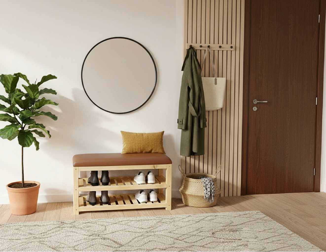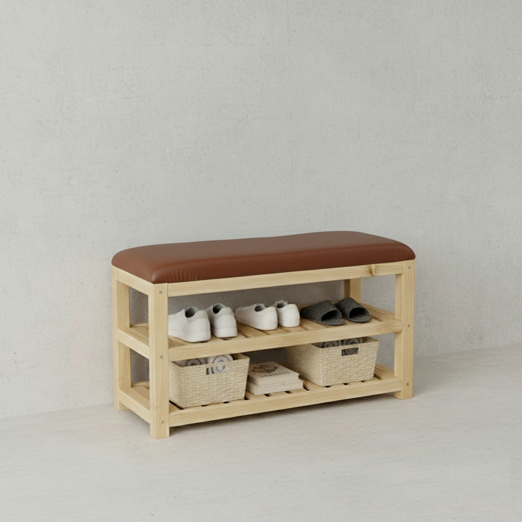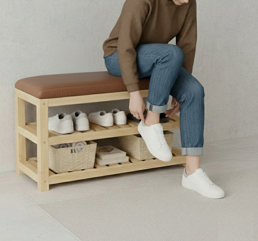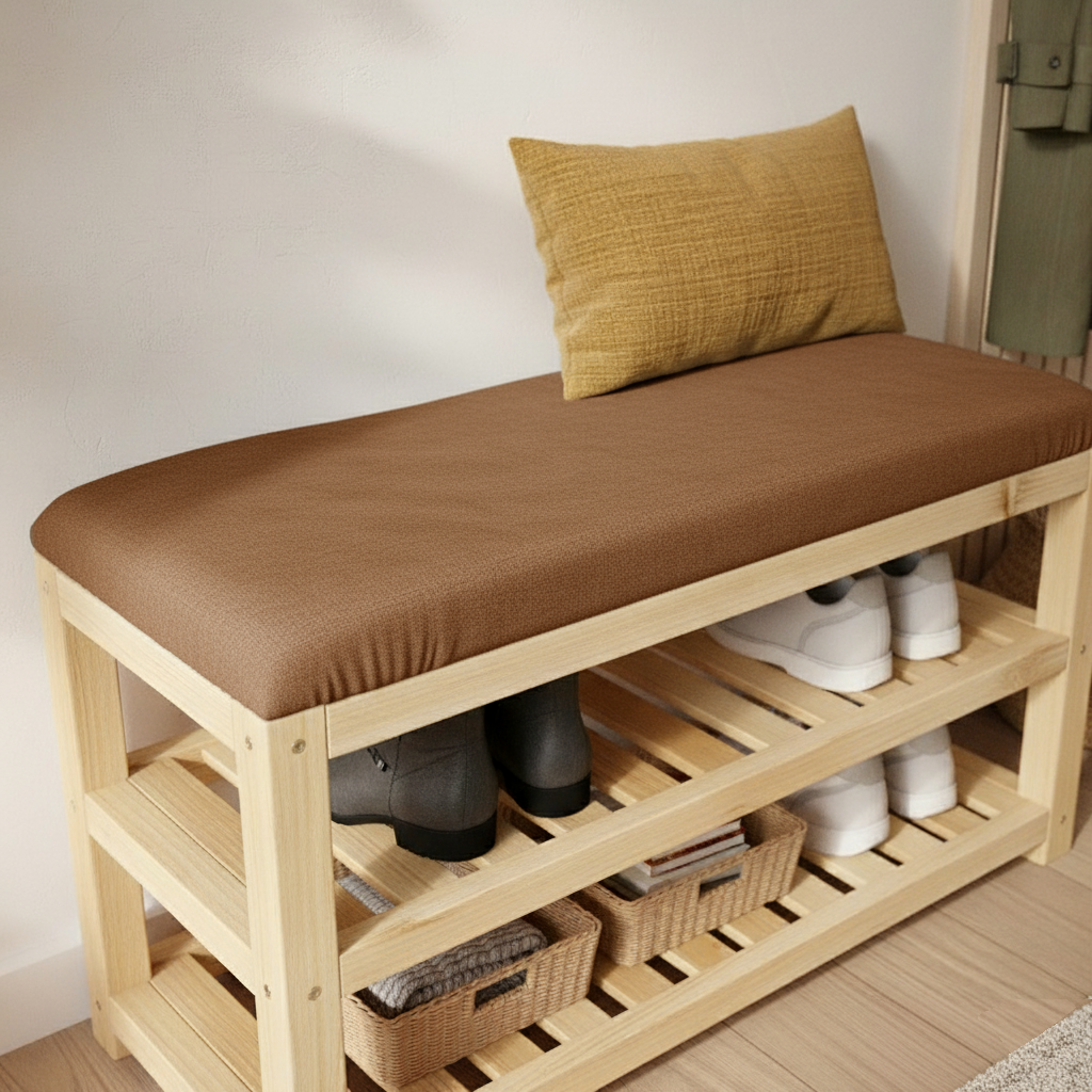 Banquette d’entrée pour rangement des chaussures fait en bois massif. Avec 2 niveaux étages de rangement pour les chaussures.
